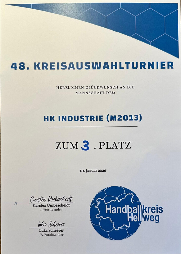 Obwohl der HK Industrie mit nur 10 Spielern stark dezimiert antrat,.stellte Kreisauswahltrainer Philip Bankwitz die Mannschaft gut ein und alle im Team bekamen entsprechend viel Spielzeit. In allen vier Spielen konnten unsere drei Rauxeler Jungs sich neben solider Abwehrarbeit auch mit zahlreichen sehr guten Vorlagen und vielen ansehnlichen Toren auszeichnen. Das Team musste sich nur im zweiten Spiel gegen das stark überlegene Team HK Hellweg Jg. 2013 geschlagen geben (7:16),.das am Ende auch das Finale deutlich für sich entschied. Das erste und dritte Spiel gegen HK Münsterland und gegen HK Hagen/Ennepe-Ruhr in der Gruppenphase konnte der HK Industrie im Siebenmeterwerfen gewinnen. Im Spiel um Platz 3 konnte man sich am Ende gegen einen stark aufspielenden Jahrgang 2014 des HK Hellweg durchsetzen. Die Bronzemedaille wurde demzufolge lautstark bejubelt und gefeiert.